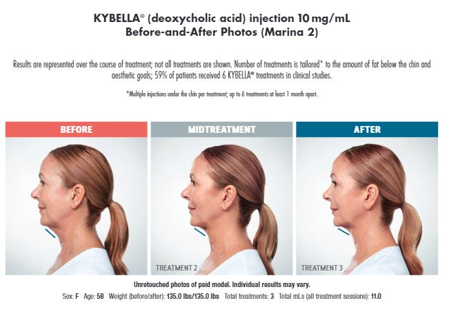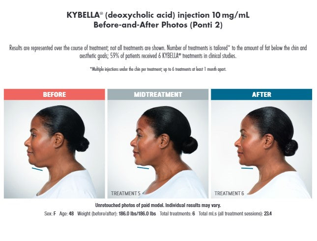 The active ingredient in KYBELLA is deoxycholic acid, a naturally occurring molecule in the body that aids in the breakdown and absorption of dietary fat. When injected into the fat beneath your chin, KYBELLA causes the destruction of fat cells. Once destroyed, those cells can no longer store or accumulate fat. With available treatments for lifting, tightening, and increasing cell turnover (none of which target “submental fullness”), KYBELLA is a standalone product, making for dynamic differences in appearance, and confidence.